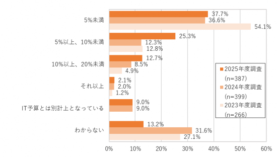 生成AIの活用に向けてデータの整備を強化したいというモチベーションが高まる中で、データマネジメントに対する企業の本気度、優先度がどの程度変化しているかを、企業内で取り組まれる施策の優先順位が最も端的に現れる予算配分で見てみました。IT投資予算に占めるデータマネジメントへの投資比率を見ると、2024年度と同様に「5%未満」の企業が最も多く37.7%を占めていますが、「5%以上10%未満」と回答した企業が2024年度の15.3%に対し2025年度は25.3%と大きく増加しています。また、データマネジメントに関する人材や組織の課題として「予算が確保しにくい」を上げた企業は過去2年間では連続して3割を超えていましたが、2025年度は29.2%とはじめて20%台となり、データマネジメントへの投資は、まだ配分比率が多いとはいえないものの、少しずつ上向いているようです。